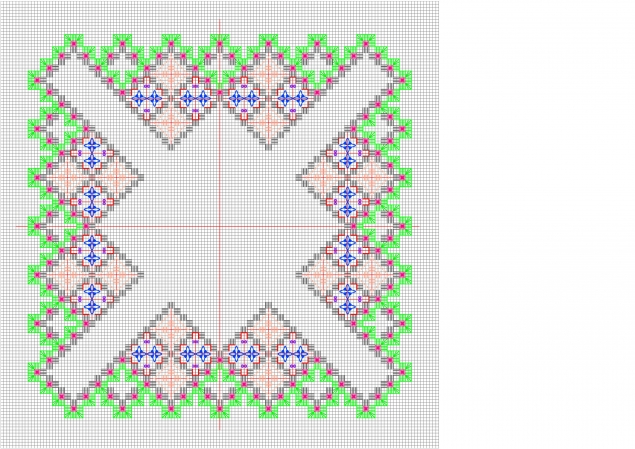 Блоки всех элементов вышивки создаются каждый в своём слое. А далее, расставляю их в соответствии с выбранным рисунком или фотографией нужной вам салфетки или какого-то другого изделия, используя необходимые для создания схемы блоки, применив команду «вставить блок». Если схема симметричная, то достаточно начертить только половину её, выполнив команду «зеркальное отображение». Если схема квадратная, то и четверти достаточно, применив только дважды команду «зеркальное отображение».