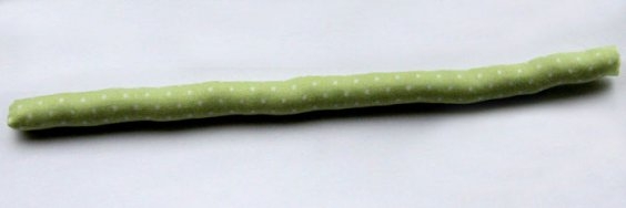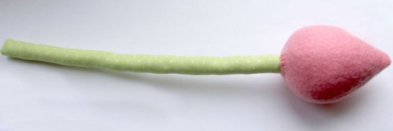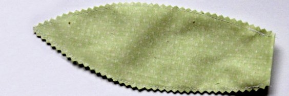 Примерные размеры бутона: 9 см в высоту, 5,2 см в основании и 5,5 см посредине. Лист может быть 16,5 см в длину и 5,5 см в ширину (середина). Стебель – 20 см на 2 см. Не забудьте припуски на шов.Делаем стебель: сгибаем наш узкий прямоугольник, обшиваем его, оставляя отверстие для выворачивания. Получается что-то вроде чехла. Затем срезаем излишки ткани. Не режьте вплотную ко шву, иначе он разойдется.