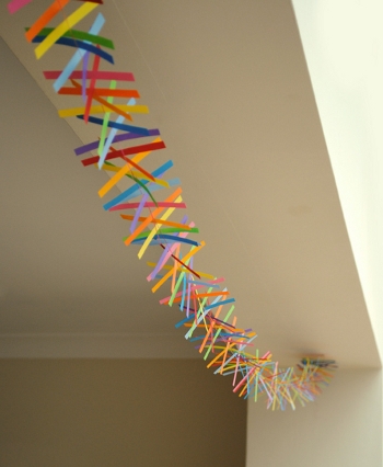 Еще один очень простой способ сделать гирлянду — нарезать цветной картон неширокими полосками или взять пластиковые полоски — закладки, которые продаются в каждом магазине канцтоваров. С помощью швейной машинки или обычной ручной иголки эти кусочки кладутся рядом друг с другом и сшиваются ниткой. На один конец нитки прикрепляется груз – кусочек пластилина, тяжелая пуговица, чтобы гирлянда сильно не болталась, а за второй конец она вертикально подвешивается, например, к люстре.