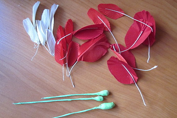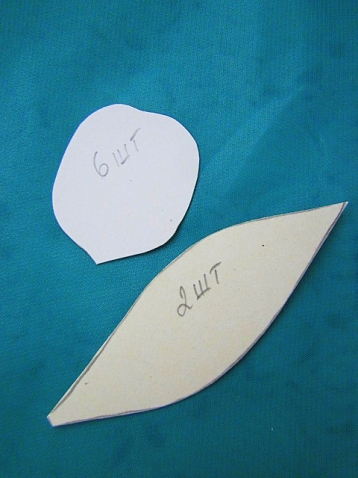 К каждой детали аккуратно с изнаночной стороны по середине, не доходя примерно 1-1.5см до верхнего края, приклеиваем литон. Литоны могут быть такого же цвета, как и ткань лепестка, а могут быть и просто белыми. На готовой работе видно их не будет.