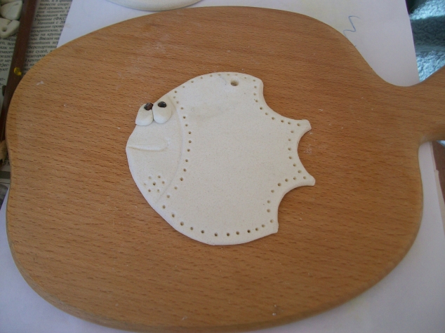 Можно запечь в духовке, я овечек подсушивала при 80 градусах, но мне больше понравилось сушить на воздухе, хотя это дольше. Красила белой краской я только рыбку-гжель, чтобы была ярко бело-синяя, все-таки тесто желтоватое получается. Остальных рыбок немножко подкрасила белой под салфетки и разноцветными в тон салфеткам.