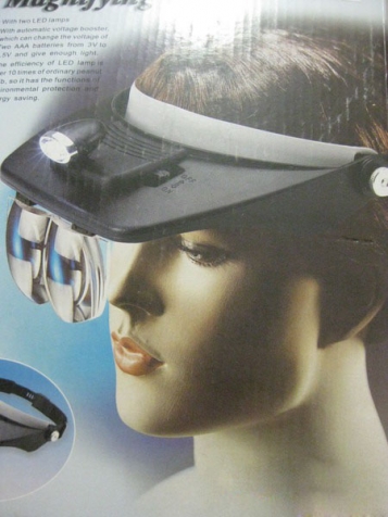 С дрожью в руках от нетерпения мы ее открыли сразу же как только пришли домой, немного посмеялись на мой вид, но если б вы видели мое удовольствие от работы в том "шлеме"!!!!! Это не передать словами! Ну во-первых, в комплекте есть еще вот такая волшебная коробочка с линзами разной диоптрии, поэтому можно подобрать к любым глазкам, линзы регулируются по углу наклона, Есть еще и лампочка, которая локально освещает работу. Правда с этой лампочкой во лбу мы сразу становимся похожими на Царевну-Лебедь, но это-то и поднимает настроение!