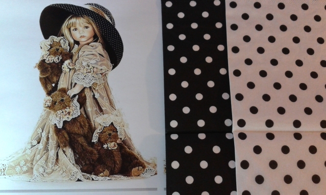 Девочки, ну не могу я без вашей помощи!!!!!!!!!!!! Решила сделать для своей невестушки шкатулочку, долго искала картинку то цветочки, то еще что то, а тут увидела картинку и все, влюбилась в нее, обежала пол Барселоны в поиске салфетки черной в горошек, нигде нет, зашла в свой любимый магазинчик где куча всяких салфеток, в пачками и по одной. Спросила. у продавца, она достала ящик с салфеточками поштучные, и нашла белую в черный горошек, а наоборот сказала что нет, а потом нашла, она осталась одна, и вот теперь я на распутье какую выбрать. У девочки шляпа черная в белый горошек. Помогите определиться