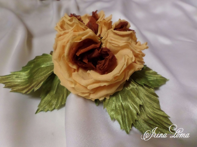 Немного о том, что увидела: в желтой розе многовато «воздуха» в середине получилось, в красной серединка отличная! В красной розе очень понравился окрас листвы, переход цвета. Классно! Все-таки ручное окрашивание очень красит цветы! Насчет староанглийской розы — она у вас получилась хорошо, трудность у нее в том, что должны получаться 3 шарика, но они должны находиться в одной плоскости, не должны сильно «отворачиваться» друг от друга… Тут, конечно, только руку набивать.)))