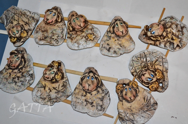 Рельеф на тесте отпечатывала при помощи вязаной салфетки, а так же какой-то упаковочной красоты, оставшейся от праздничного букета. Не забыла сразу сделать некоторые манипуляции: дырочки для ножек, подвесок и вживила бамбуковые палочки.. Ну овечки у меня планировались в виде подвесок, магнитов и цветочных украшалок.