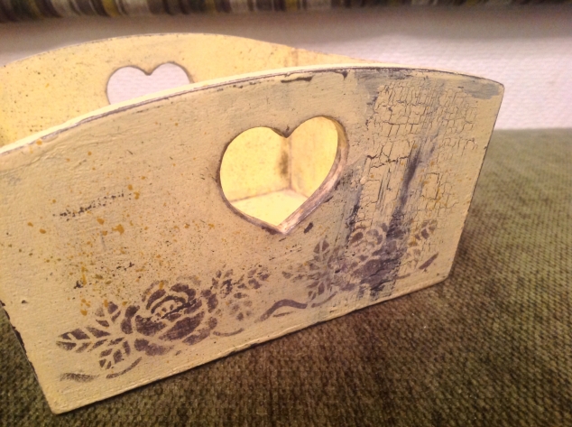 Внутри получилось намного лучше. Сторона с розами тоже неплохо смотрится. А вот там, где кракелюр, там грубовато. Одношаговый очень капризный и непредсказуемый состав. Чтобы он получился нежным его надо наносить совсем тонким слоем и сверху краску мазать не кисточкой, а чпокать губкой и поровней. И мне не очень нравится набрызг цвета охры. Он мрачноват.