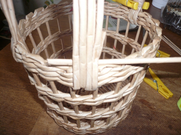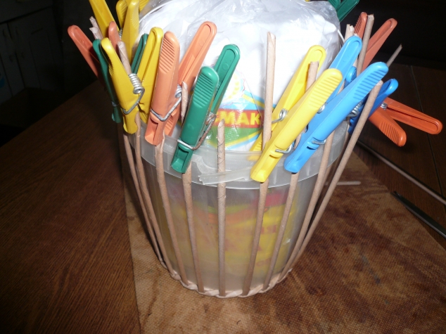 Поднимаем трубочки, закрепляя для удобства. После того, как оплетём первый ряд, прищепки не нужны будут - трубочки и так уже никуда не денутся