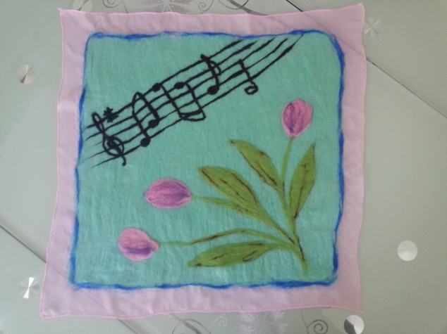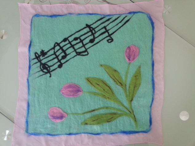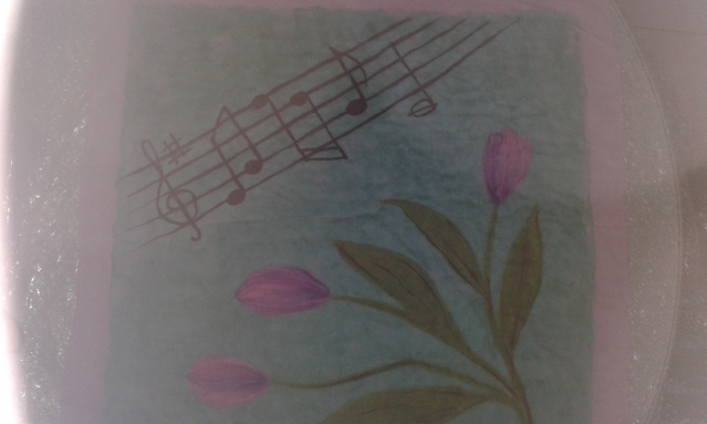 сверху выложим чёрной шерстью нотный стан и нотки, опять мочим и притираем.