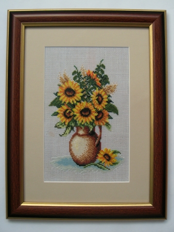 И ты, и моя Алёнка — умницы, приготовили рукодельные подарки: ты для своей Юленьки вышила и оформила комплект для вышивания, а Алена вышила для меня подсолнухи.