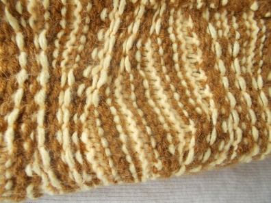 2 ряд – темная нить: вязать по рис., т.е. петли, провязанные в предыдущем ряду, провязать изнаночными, а снятые в предыдущем ряду, - также снимать, не провязывая.