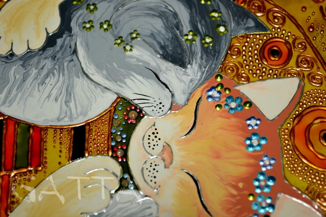 Наверное, многим, если не всем, известна картина замечательного художника Густава Климта "Поцелуй". Это, пожалуй, чуть не одно из самых тиражируемых произведений искусства! Картина тысячи раз была увековечена не только в репродукциях, но и на чашках, сумках, одежде, пледах и других предметах обихода. СтОит ли удивляться, что появилась вот такая интерпретация "Поцелуя"?) К тому же и сам Климт с нежностью и обожанием относился к кошкам.) Спасибо мастеру, который смог создать подобную котоживопись))