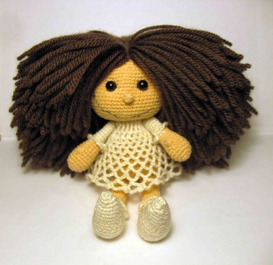 Волос прямо копна получилась, как у домовёнка Кузи. Мне поравилось, как они лежат, и подстригать-растрёпывать их я не стала. Крылышки при такой шевелюре уже некуда пришивать было, они бы загибались вперёд. Также от помпонов, штанишек и обвязки по горловине я отказалась, мне понравился минимализм в одежде)