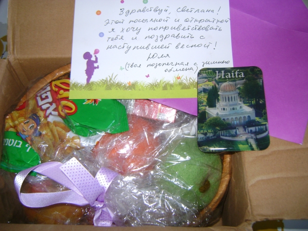 Открываем......Сверху письмо с поздравлением и магнитик с видом г.Хайфа...