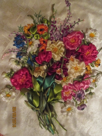 Что, вот так вот попросили и тут же вышила? Ничего себе! Уж не знаю, какие это цветы, но такой шикарный букет! Очень красиво получилось!