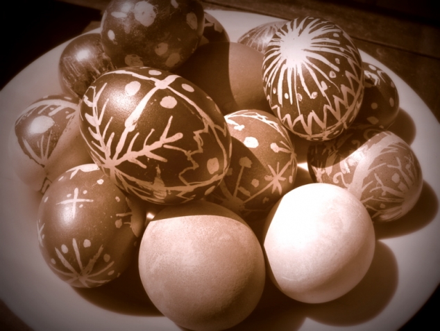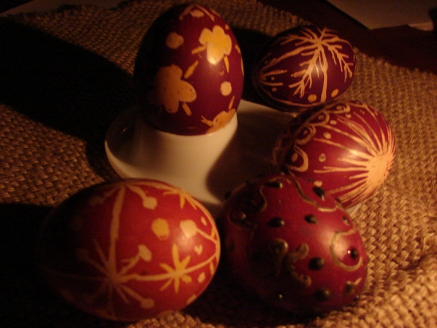 Очень давно я пробовала раскрашивать яйца воском и красками. Делала шкрабачки - просто на окрашенном яйце продирается иголкой узор, потом не на долго "присела" на практичные наклейки. А вот в этом году так захотелось писать воском, что я заказала в интернет-магазине набор для писанок. В четверг вечером начала....