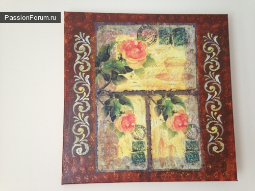 Materialy:akrilovye kraski,risovaja bumaga s motiwom,shablon s uzorom, lak dlja decoupage