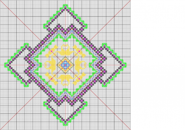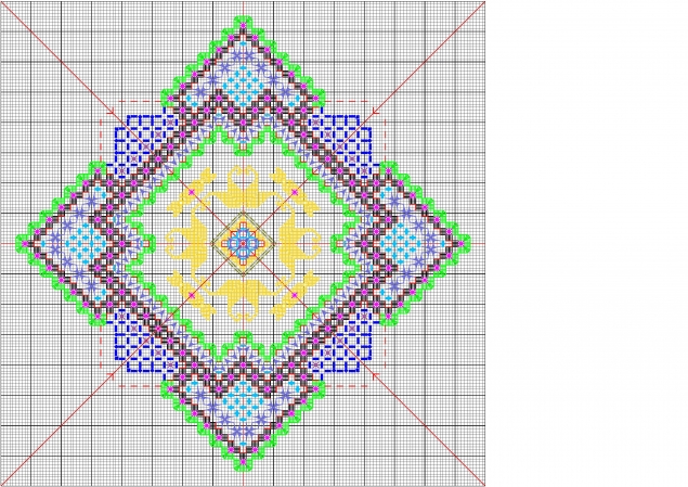 Размер салфетки 300х300 нитей + 5 см канвы для запаса. Тамара нашла в интернете такую информацию, что на равномерке 27 каунта размер салфетки получается : 27х27 см по диагональным линиям и 20х20 см по горизонтали и вертикали.