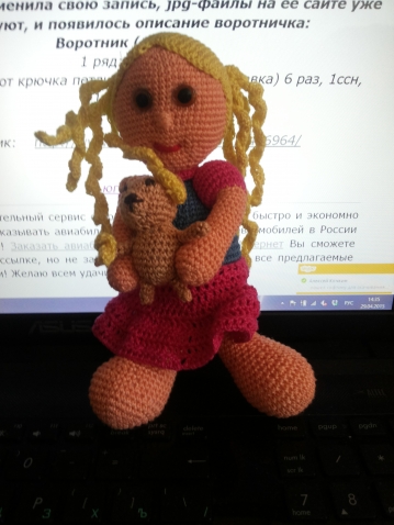Я совсем замоталась, простите, и одёжка кукольная никак не «родится». Ножки-ручки пришила, волосы сделала… А с одёжкой беда — то, что есть, не очень нравится, а своего пока не придумаю никак. Но в ближайшие дни постараюсь закончить обязательно, и выложу фото.