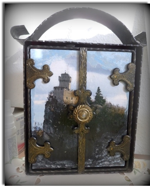 Нашла подходящую (как мне показалось) картинку с замком на горе, окружающий пейзаж дорисовала. По металлу немного прошлась почти сухой кистью с золотой краской. А внутри — что-то типа старой крепостной стены, на ней плющ.