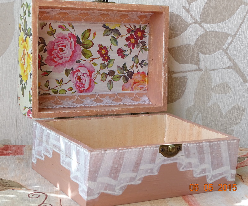 Набор для косметики - держу там дамские штучки - неудачная попытка рисованного кружева. Сделала вывод, что усилия добиться совершенства не всегда приводят к желаемым результатам...Это, скорее, пример, как НЕ надо делать. Хотелось нарисовать кружево более похожим на настоящее, вырисовывала несколько раз и оно получилось таким плотным, что попыталась исправить наждачкой и добилась только мазни с царапинами. А достаточно было провести кистью один раз...Возможно, придется все снять и переделать. Но неудачная попытка - тоже опыт, который пригодится в будущем.