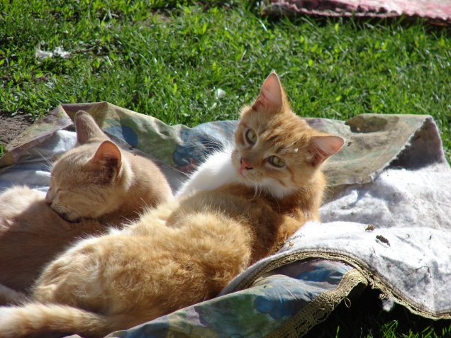 Рыжий опекает Маню. И не только. Меня вчера уморило, так они все дружно забрались на спину и присыпали меня.