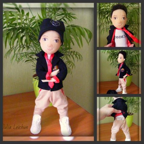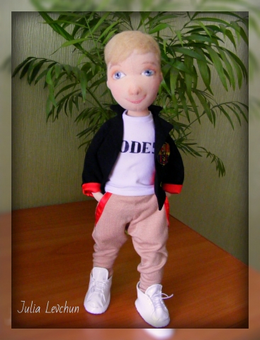 Рост 37 см, каркасный. Личико вышито. утяжка, макияж - пастельный мелок. Волосы - кардочесаная новозеландская шерсть. Футболка - белый трикотаж-масло, надпись выполнена акрилом. Пиджак - черный штапель, подкладка - красный атлас. Эмблема - ручная вышивка. Брюки - трикотаж, карманы оторочены атласом. Кроссовки - белая перфорированная эко кожа, подошва - флис. Шапочка из дайвинга, вышивка серебряной нитью.