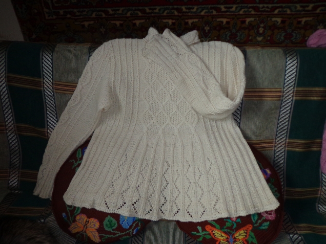 Белую кофту вязала из б/у шерсти. Попробывала по памяти ромбы, расчитала их размер. И ношу.
