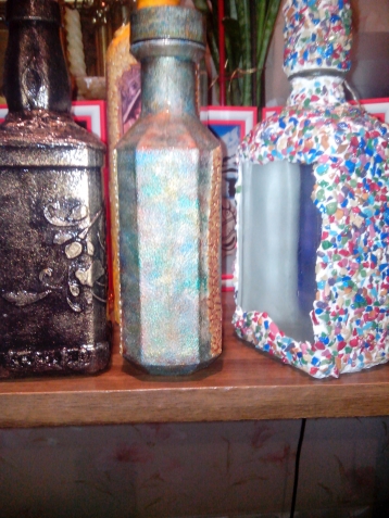 бутылки с драпировкой — неоднозначное мнение, темные стороны красиво сделаны и прокрашены мастерски, а вот лицо- что-то не так, эти яркие гламурные розочки с жемчугом- ну совсем не в тему, и первая квадратная — такая классная, синие брадсы замечательно вписались, но зачем в нее эти фантики натыкали, весь вид портят, с подсолнухами — вообще непонятно, что вы имели в виду, деревенские подсолнухи ( типа Кантри) и гламурные барышни, что между ними может быть общего?