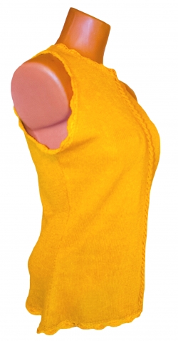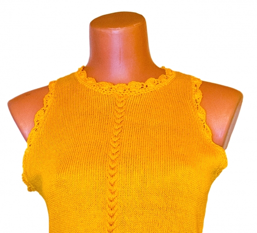 Модель выполнена на основе машинного трикотажа с ручной отделкой крючком. При изготовлении использована пряжа 100% лен (полотно достаточно жесткое). Натуральное волокно пряжи, открытая пройма "американка" делают вещь актуальной в любую жару.