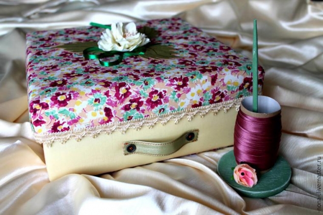 Последняя деталь коробки – донышко. Вырезаем из картона квадрат, равный дну коробки и обтягиваем его тем же способом (только вообще без синтепона). Приклеиваем на место. Готово!