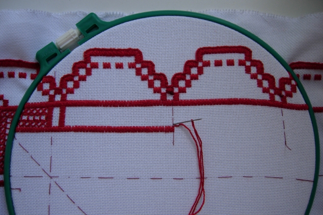 Леночка, сочувствую, но ошибку нужно найти. Барджелло может не получиться.Поэтому я НАСТОЯТЕЛЬНО советую — прошивайте маячки!!! Вышили две стороны — не поленитесь, проложите тонкой нитью стежки. Чем чаще проложите контрольные стежки, тем больше вероятность, что, если даже и придётся пороть, то вовремя и совсем немного.