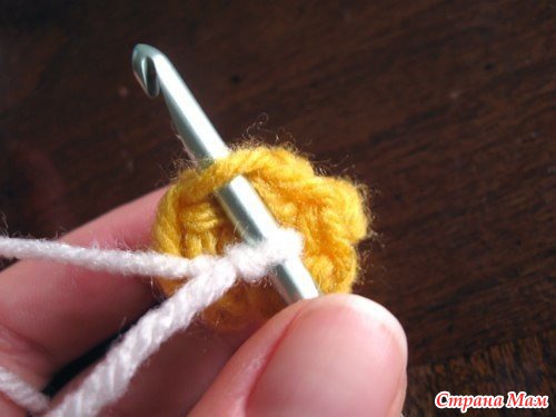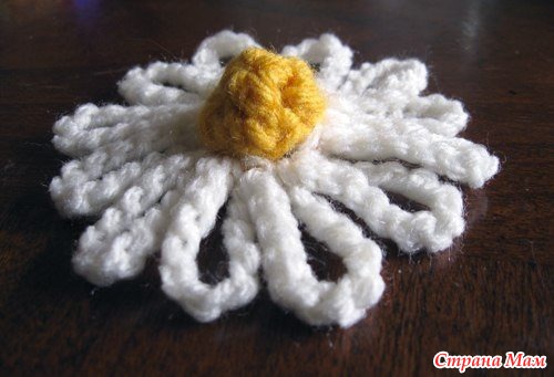 Для серединки связать цепочку из 2-х петель, затем 5 столбиков без накида. Далее, в каждую петлю провязать по 2 столбика без накида. Третий ряд — провязывать две петли предыдущего ряда, как одну. Должно остаться 5 петель, получится маленький комочек. Меняем цвет нити, вывязываем цепочку из 12-ти петель в каждую петлю предыдущего ряда. Должна получиться ромашка.