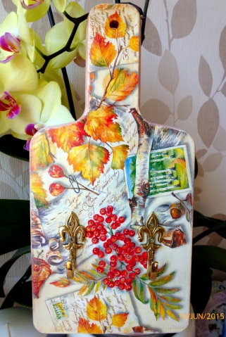 Валечка, какая яркая золотая осень! Глаз не оторвать! Но мне показалось, что крючки высоковато прикреплены. Но теперь уже, конечно же, ничего не переделать, да? Там ведь дырочки остались. И вообще, мне видится не ключница, а для кухонных полотенец. Поэтому и крючки мне хочется пониже переставить.