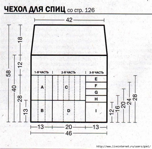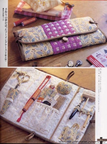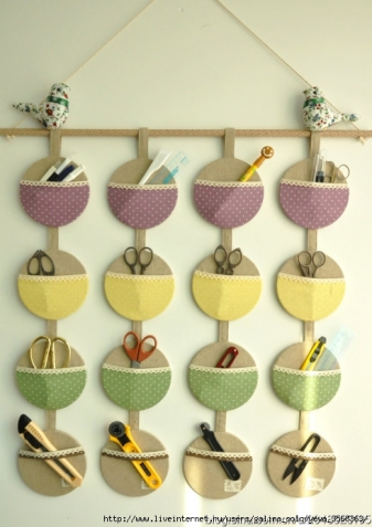 А сшить сошьете, у меня много лет на стеночке сбоку шкафа висел карман для спиц: основа картон оклеен тканью и кармашек со сборочкой и перемычкой, на днях сошью и покажу, шьется быстро и удобен в применении. 8-)