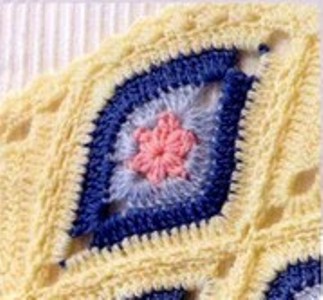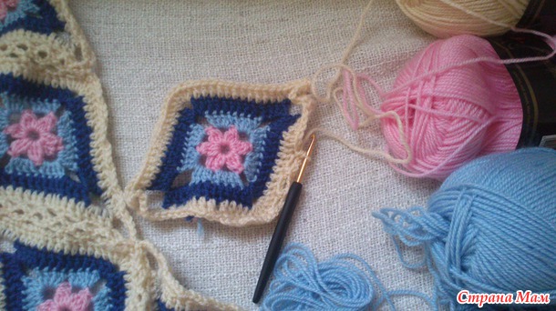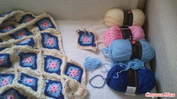 Если хотите связать такой плед меньшего размера, примерно 80Х100, то вам понадобиться по 1 мотку розового и голубого цвета, 2 мотка синего цвета, 5 мотков молочного цвета.