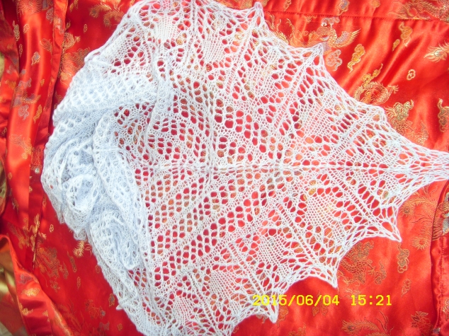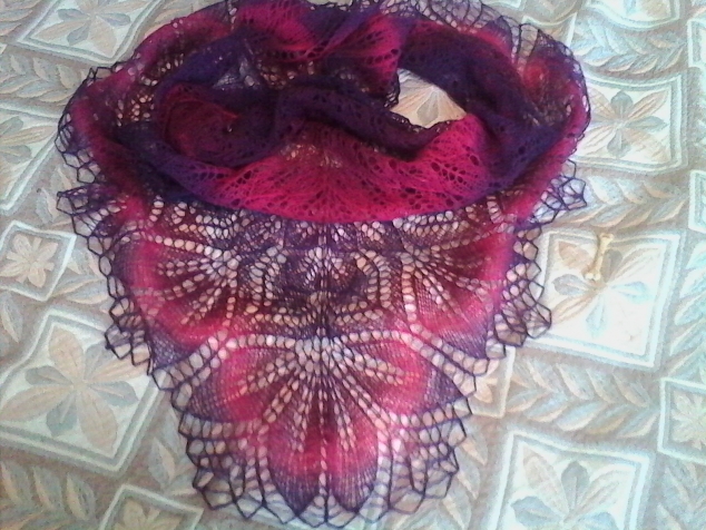 Обязательно получиться:-) :-) :-).Я вязала из Кауни 8/1Fuxia.Вязала спицами 3, а кайму-3,5.По весу шалька вышла 93грамма, размах крыльев-180, по центральной петле-105см.Удачи!!!