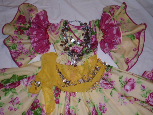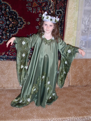 Это на рынке нечаянно купленная занавеска уцененная. Под низом комбинация, чтоб ничего не кололо. Нижняя юбка из чего-то очень жесткого, обязательно на маечке, чтоб держалась крепче. Нижняя юбка потом нам пригодилась не раз к другим нарядам. Цветы подбирались готовые.Случайно оказались из такой же подкладочной ткани