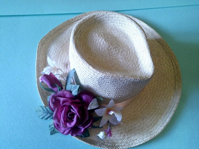 Дорогие рукодельницы! У меня много скопилось цветочков моих первых шагов в цветоделии. Выбросить жаль,а дарить уже стыдно. Решила облагородить свою старую шляпку из соломки.Роза из старых цветов. Орхидейки остались от свадебного комплекта.