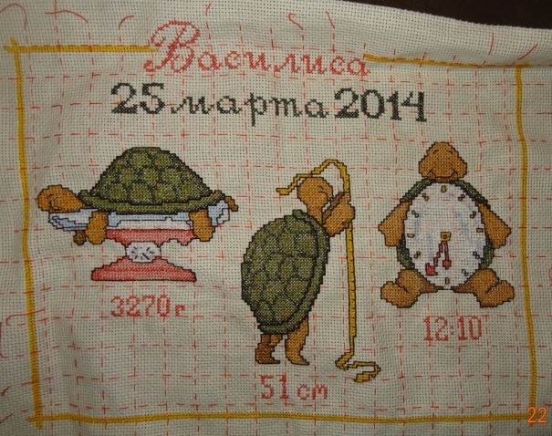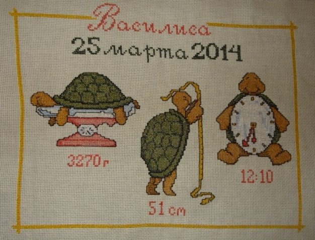 Вышивать я просто обожаю, но делаю это в основном бисером. Метрику же, для разнообразия, решила изобразить нитками.