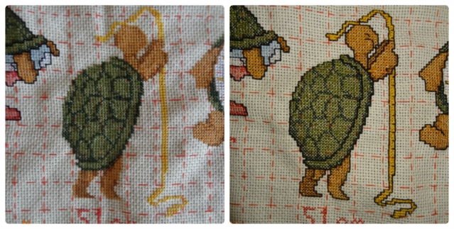 Далее я вышивала черепашек в порядке очереди. На фото - слева без каемочки, справа - с ней.