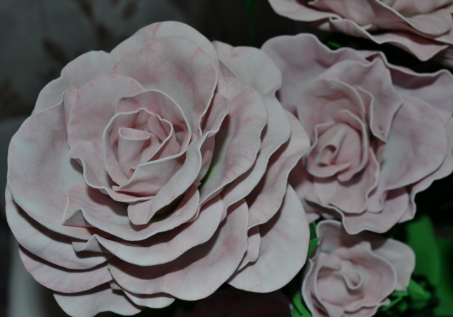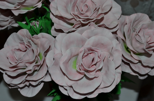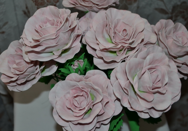 Розочки делались по той же, излюбленной мною схеме из 27 лепестков, полубутоны из 7 лепестков по меньше, на остальных количество больших лепестков варьировалось. Всего 7 основных больших роз а сколько остальных, не помню. Фом был использован белый, прокрашенный нежно розовой пастелью. Этот раз В НЕ удержалась и на больших лепестках прокрасила низ зеленым цветом (таки-для мамы все, тут мелочится не стоит).