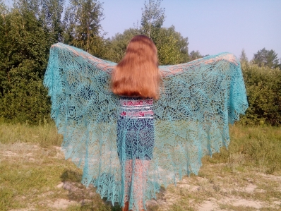 моя Фрея. размер получился 3,40 (внешний край)- 62 ( высота)- 1 м ( по внутреннему краю)спицы 3,5, ниточки Кашемир вита(35% ангорский кролик,40% шерсть 15% нейлон, 10% tencel) мягкая, нежная к телу, хорошо блокируется!)))