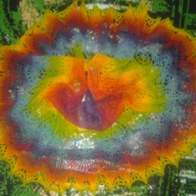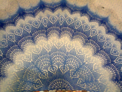 У меня было много проблем с Фреей, в основном из-за невнимательности. Но все-таки получилось. Ушло около 920 м пряжи Shadow от Knitpicks.com Шаль получилась около 60 см в ширину и 356 см длиной по внешнему краю.