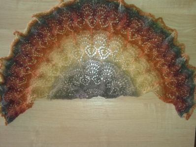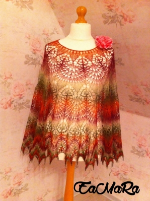 Кауни 8/1, цвет Fall, спицы N3, вес 88 граммов, высота 58см, длина по внешнему краю 264см.