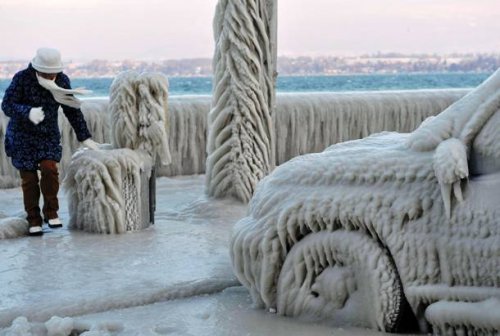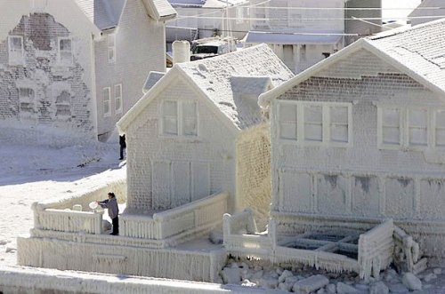 На третьем снимке заледенелые опоры моста похожи на атлантов