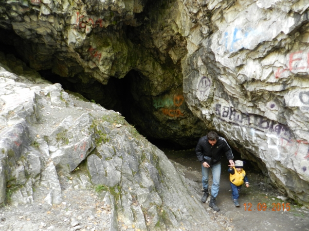 Пещера у подножия горы ребенка не впечатлила, " тут мокро"- сказал ребенок,- " я же уже боюсь темноты... и машин тут нет.." В маленькой пещере было человек 10 народу, а стены испещрены современными письменами)