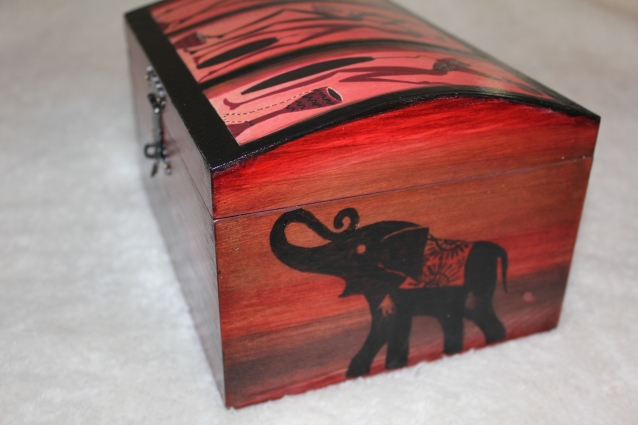 Первая с африканским мотивом, по бокам нарисовала слоников, впереди и сзади трафарет- все это на морилке.