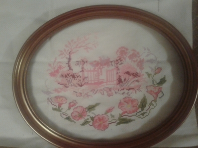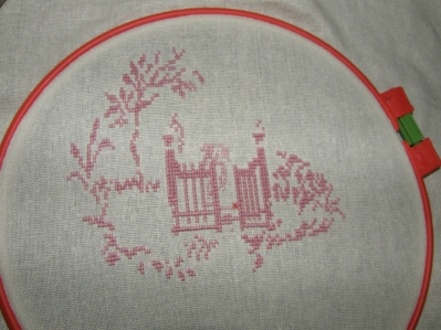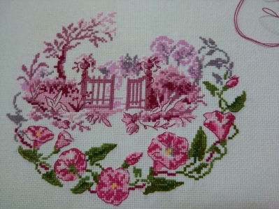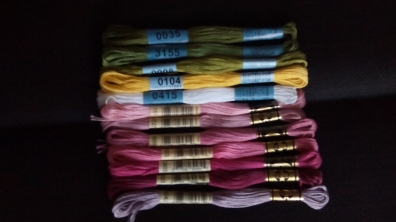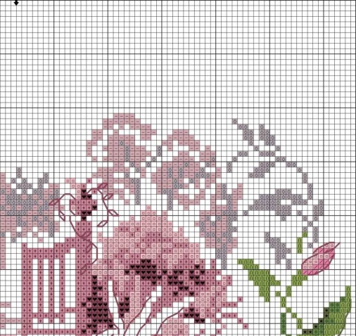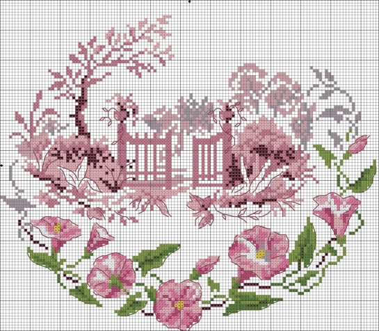 Оттенки розового ДМС - по ключу (на мой взгляд, именно они делают этот сюжет таким трогательно-нежным), а зелень - Гамма. Я беру канву белого цвета №18 (для моего оформления необходим именно этот размер готовой работы).