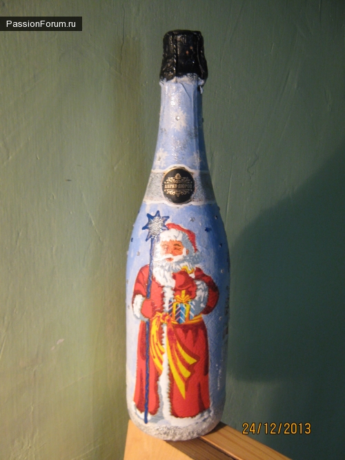 Смотрела я на все ваши бутылочки, смотрела… И тоже решила сделать новогоднее шампанской. Делала на подарок. Я вообще декупажем недавно занимаюсь, можно сказать — только учусь. Так что готова к любой критике и буду благодарна за любые комментарии.