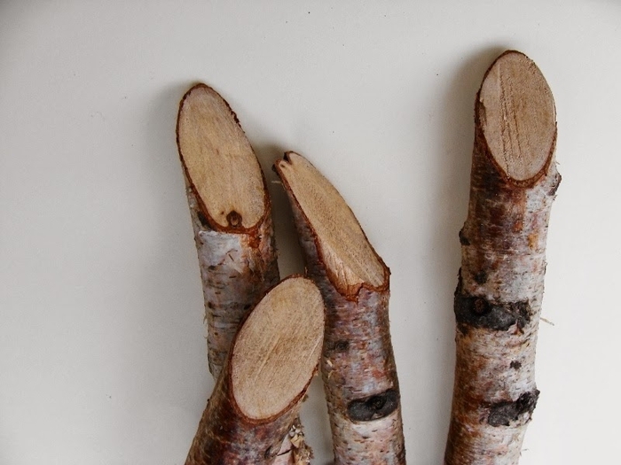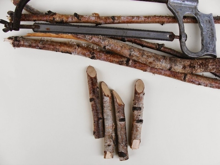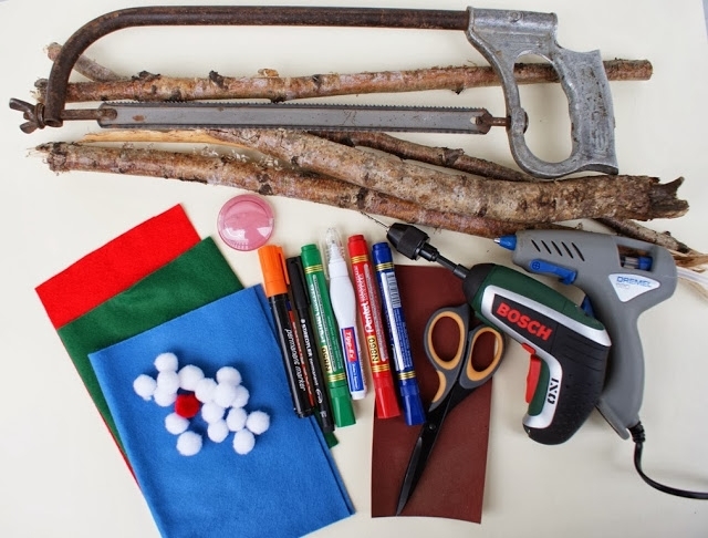 Для работы нам понадобятся ветки березы или другого дерева, лобзик или пила, термопистолет с горячим клеем, маркеры и фломастеры, ватные шарики, фетр или флис, сухие румяна, наждачная бумага и ножницы